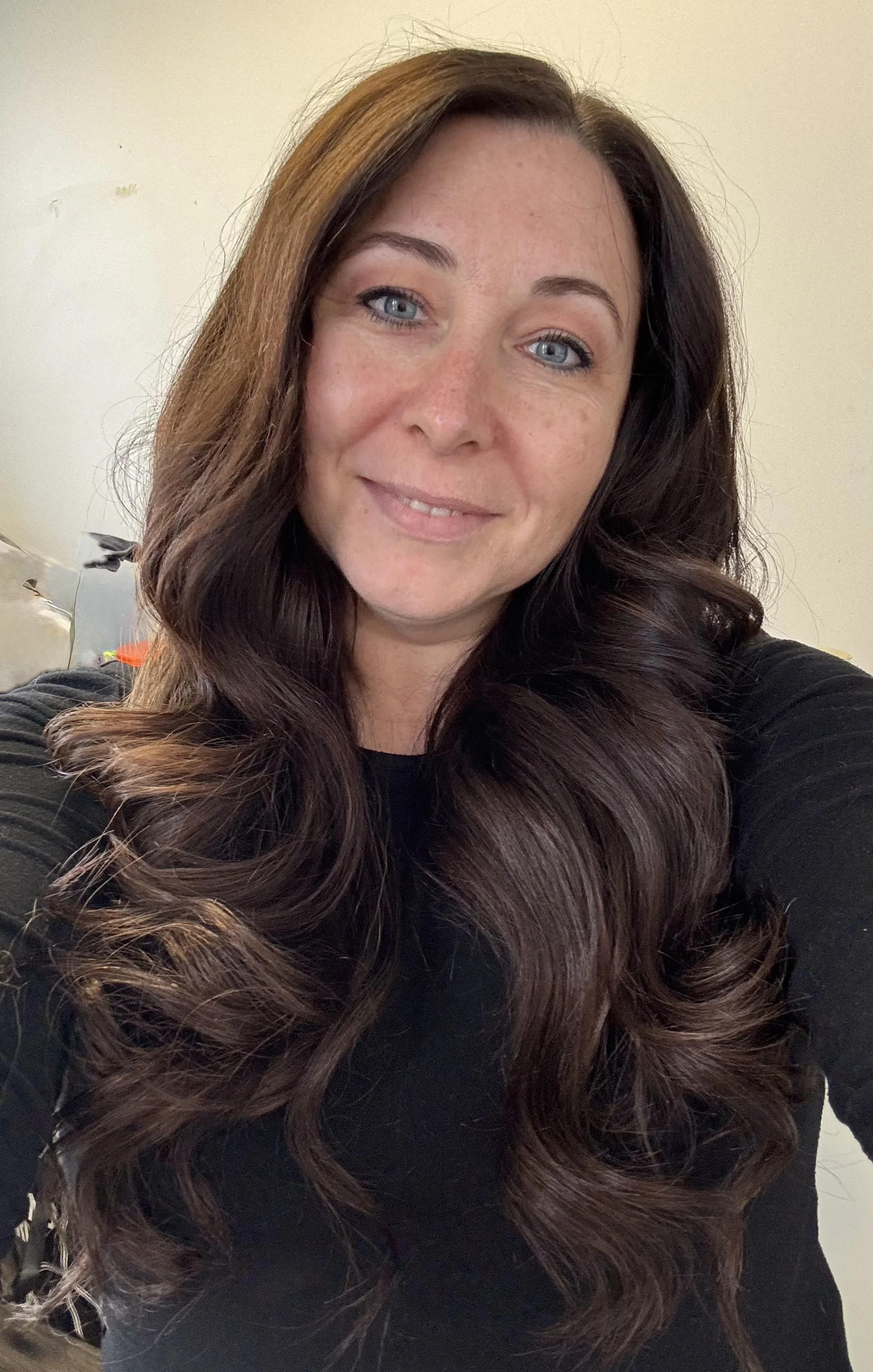 A woman with long, wavy brown hair and blue eyes, smiling at the camera, wearing a black top, in an indoor setting.
